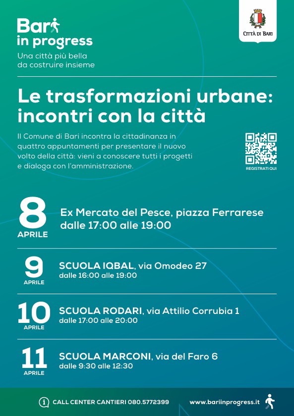 Gli incontri rappresentano un’occasione di informazione e ascolto della cittadinanza, con l’obiettivo di restituire in modo accessibile e trasparente la strategia complessiva di trasformazione urbana del Comune di Bari e raccogliere osservazioni, esigenze e proposte sui nuovi spazi della città.